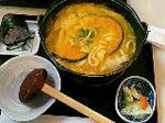信州産の地粉をつかったほうとうで、かぼちゃと野菜のはいった味噌味です。