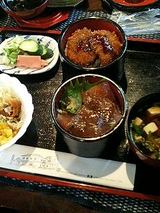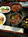 マグロ丼とソースかつ丼のミニにサラダと漬け物、赤味噌汁。